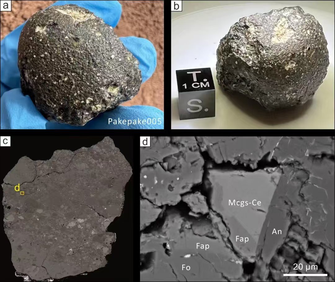 a-b: Pakepake005月球陨石, c-d: 铈镁嫦娥石及其共生矿物(图源:中国地质调查局)