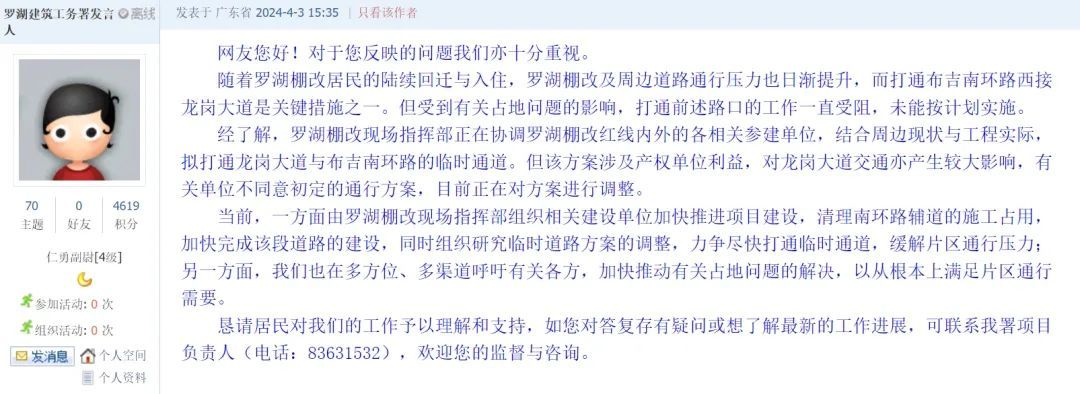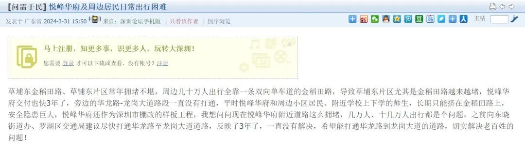 其认为,悦峰华府作为深圳市棚改样板工程,有关部门应予以重视。而打通华龙路-龙岗大道路段,能有效解决片区交通拥堵现状。3年来,其持续向东晓街道办、罗湖区交通局建议尽快打通该路段,但是问题一直得不到解决。在帖子末尾,其再次发出呼吁,“希望能打通华龙路到龙岗大道的道路,切实解决老百姓的问题。”